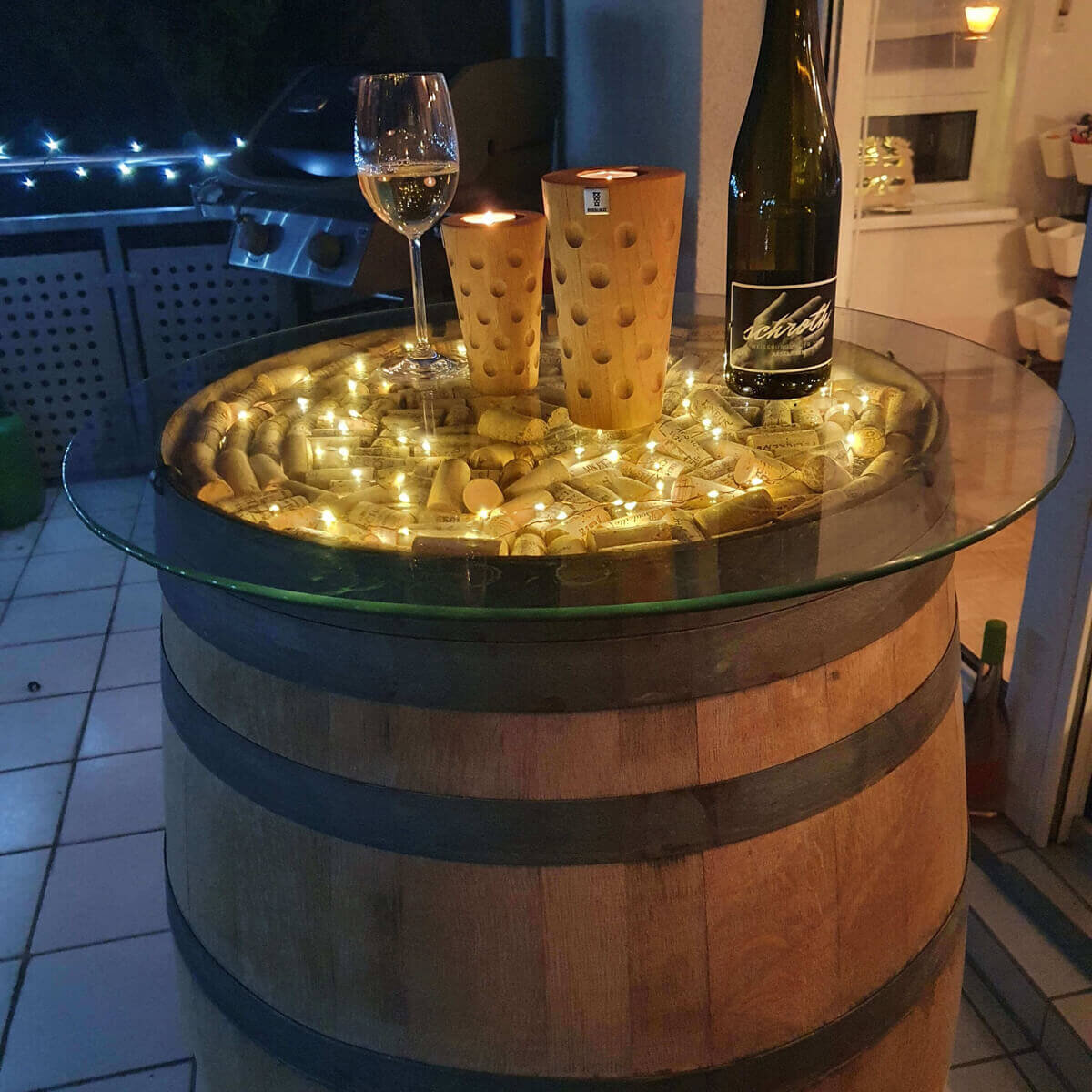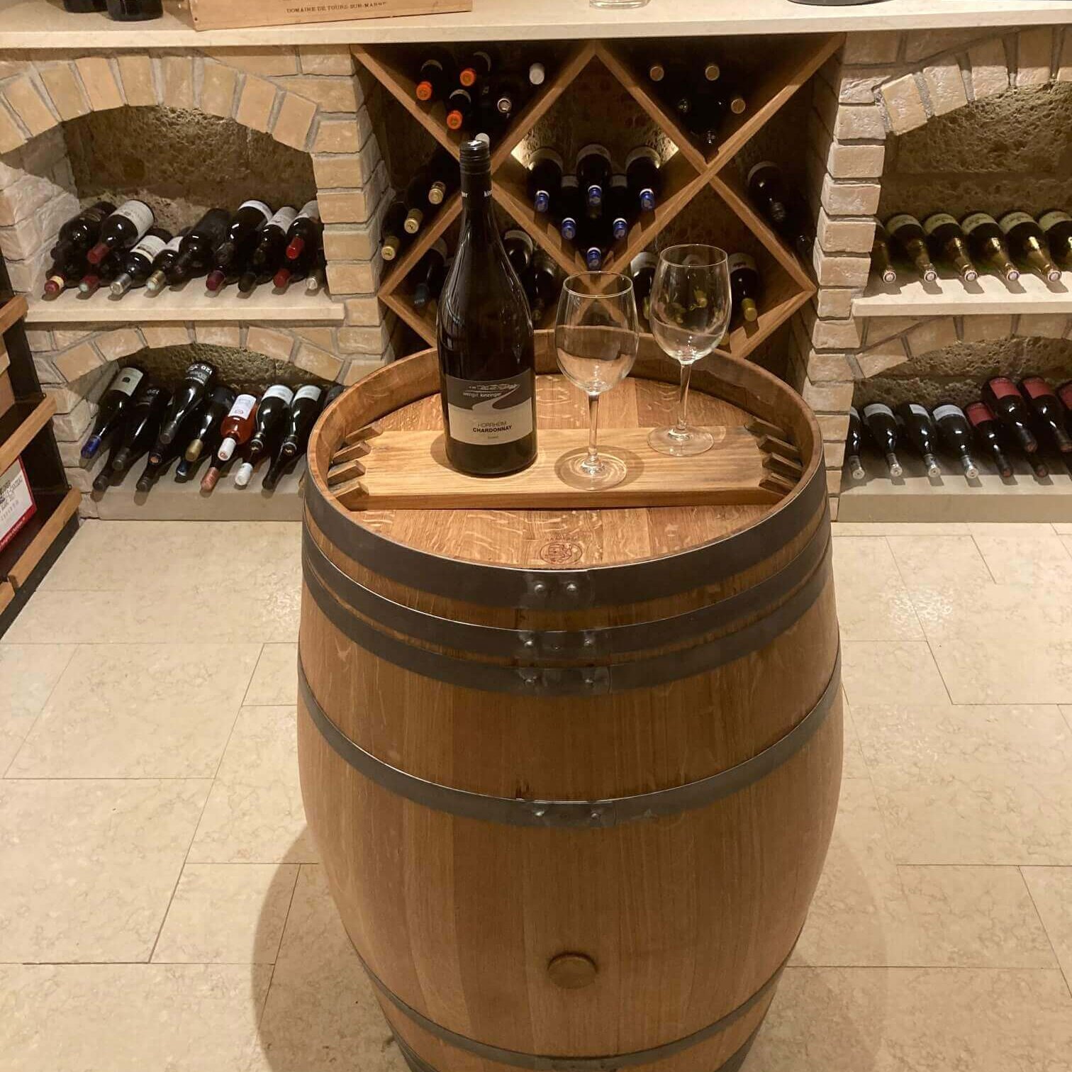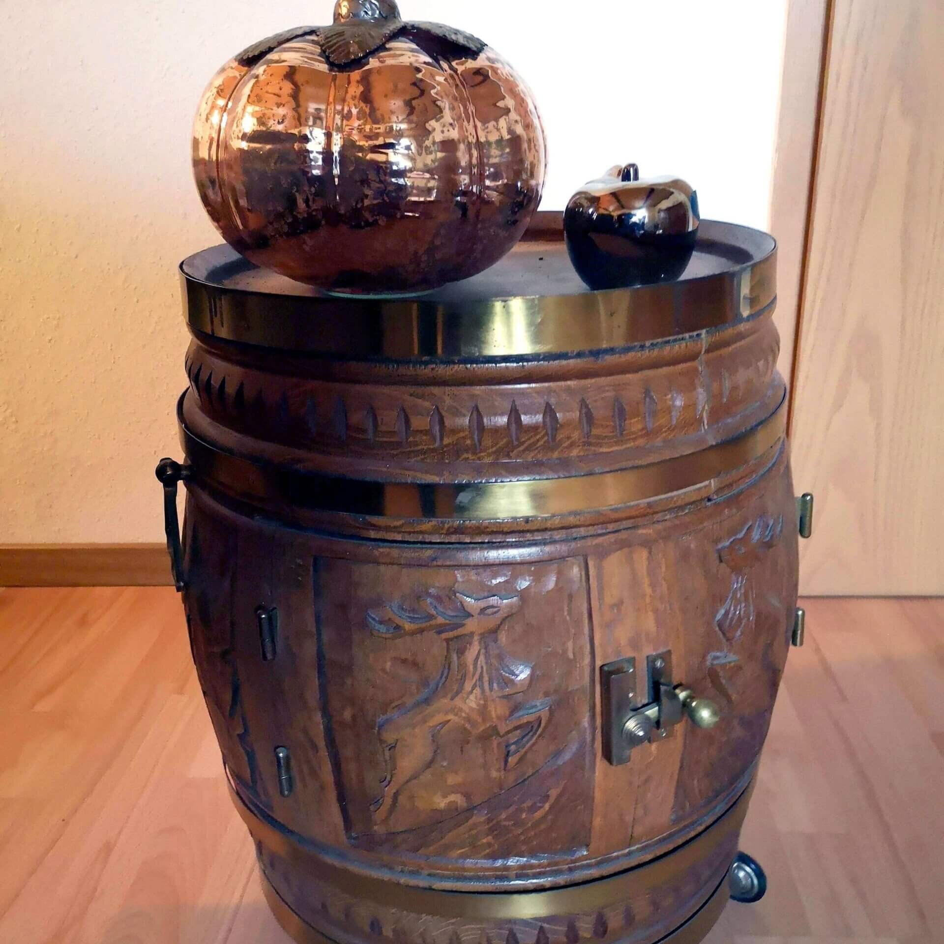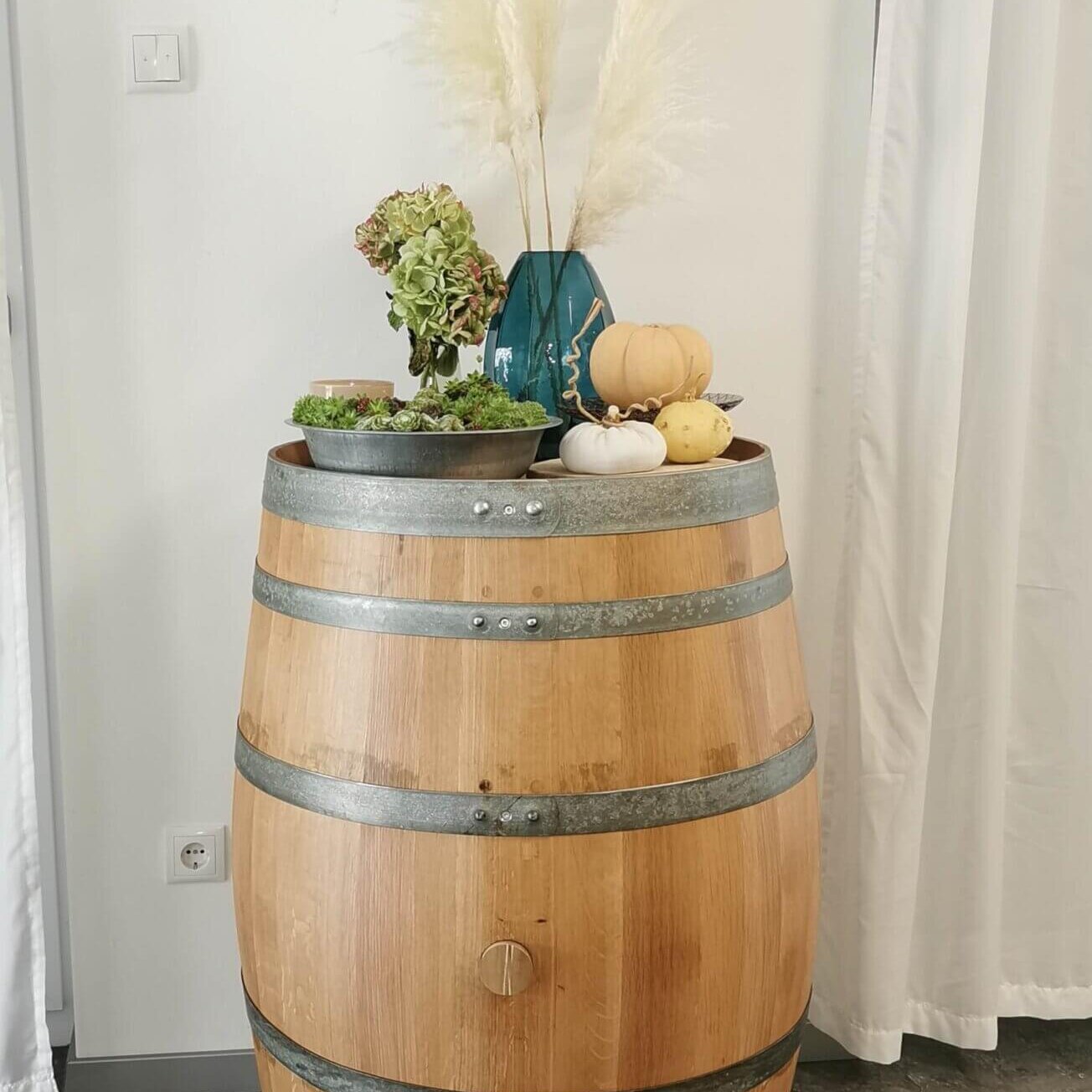 Regalfass aus einem gebrauchten 225 l Barriquefass, durch Meisterhand umgebaut als exklusives Weinlagerregal mit einem integrierten Barriquefassböden als Abstellfach für Gläser und Flaschen.