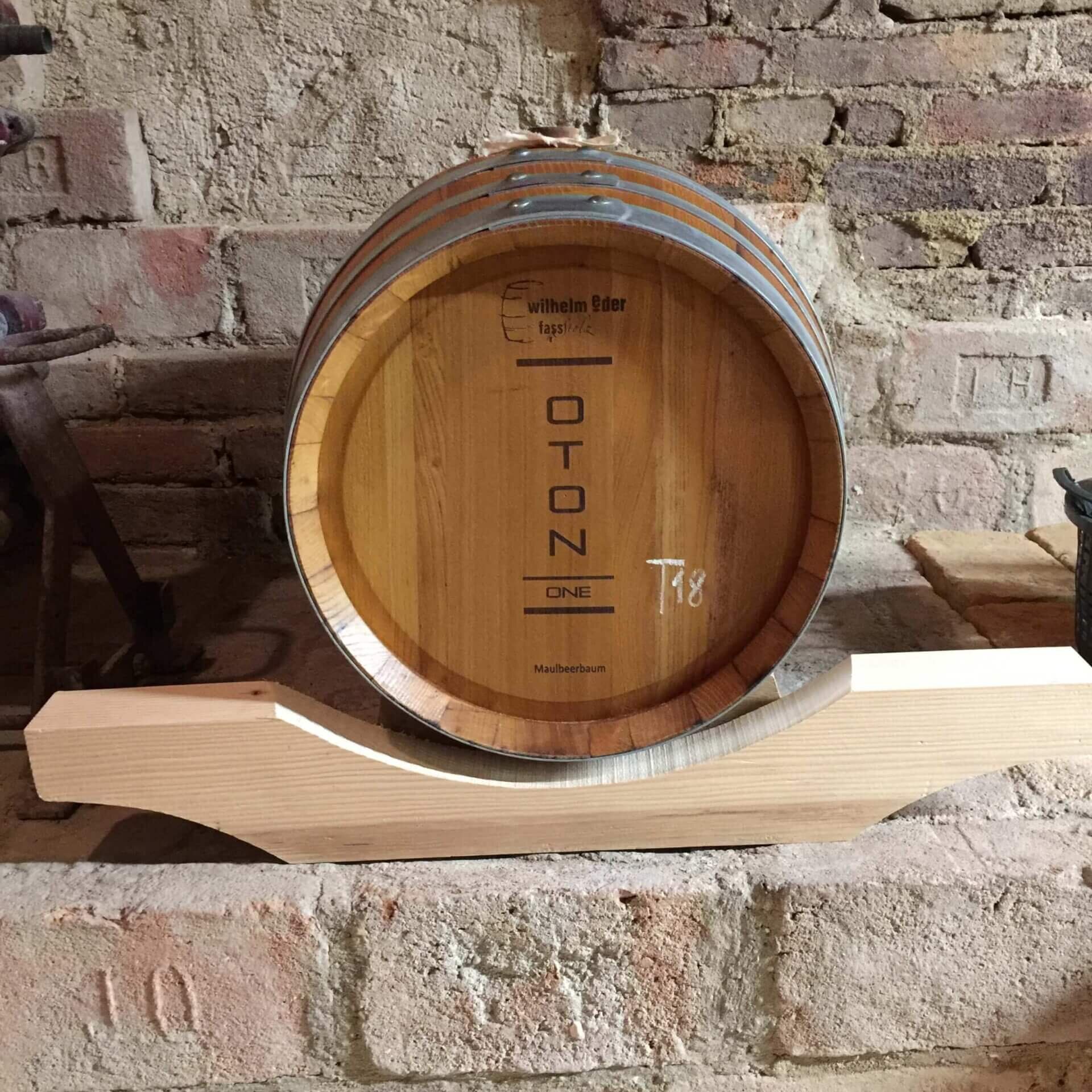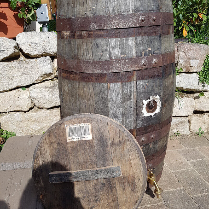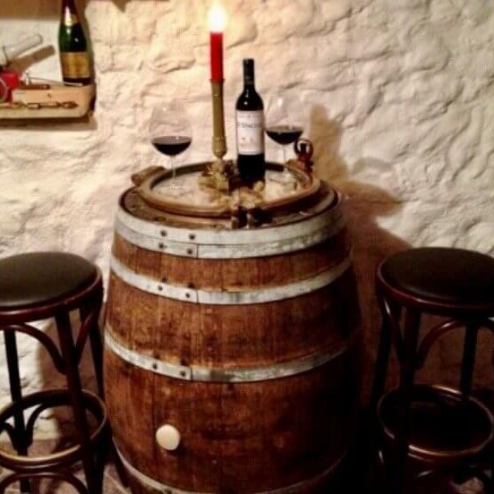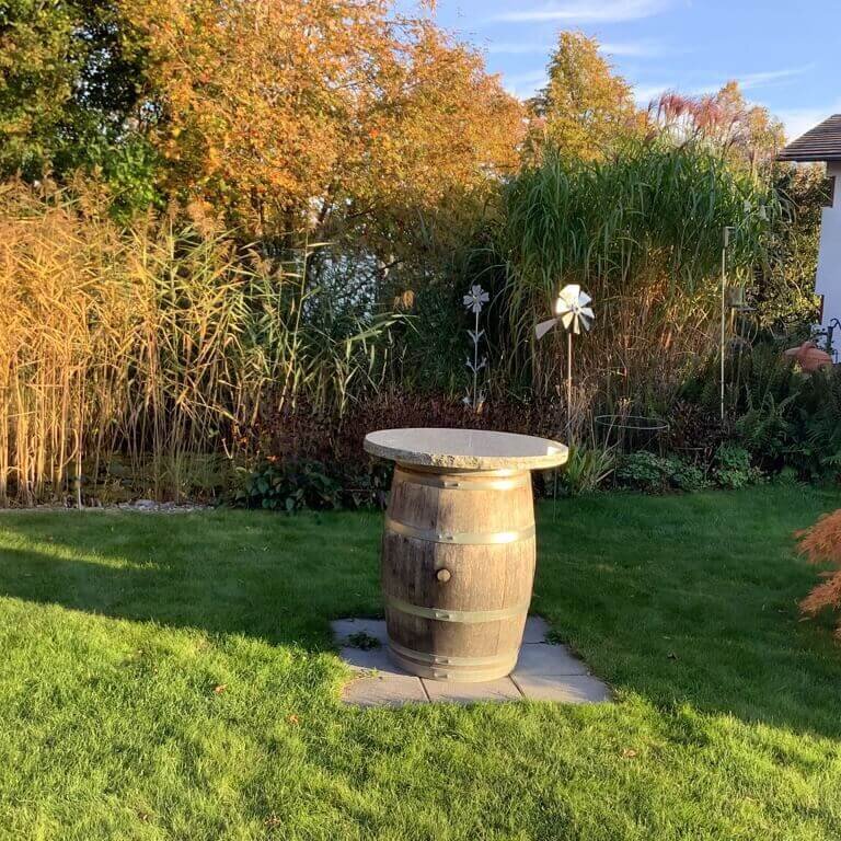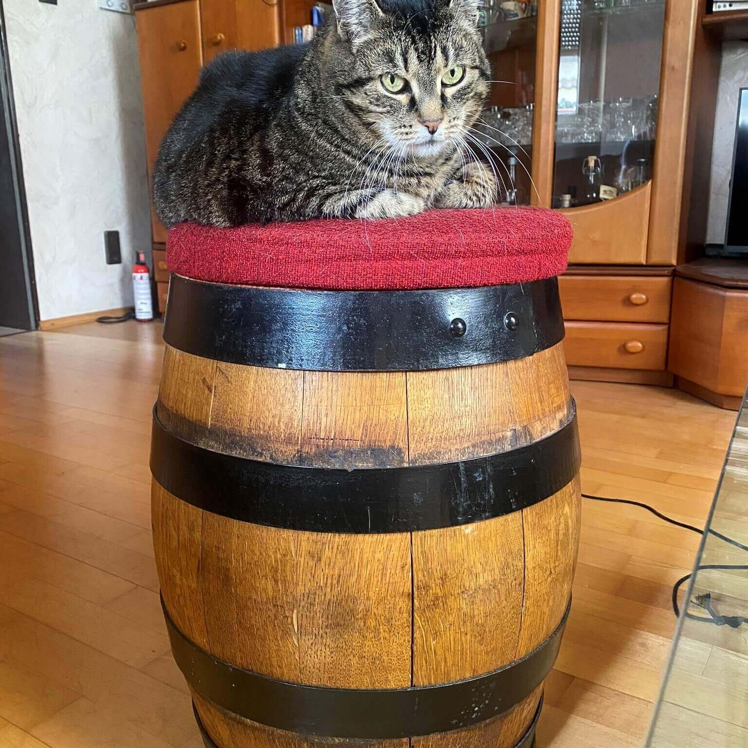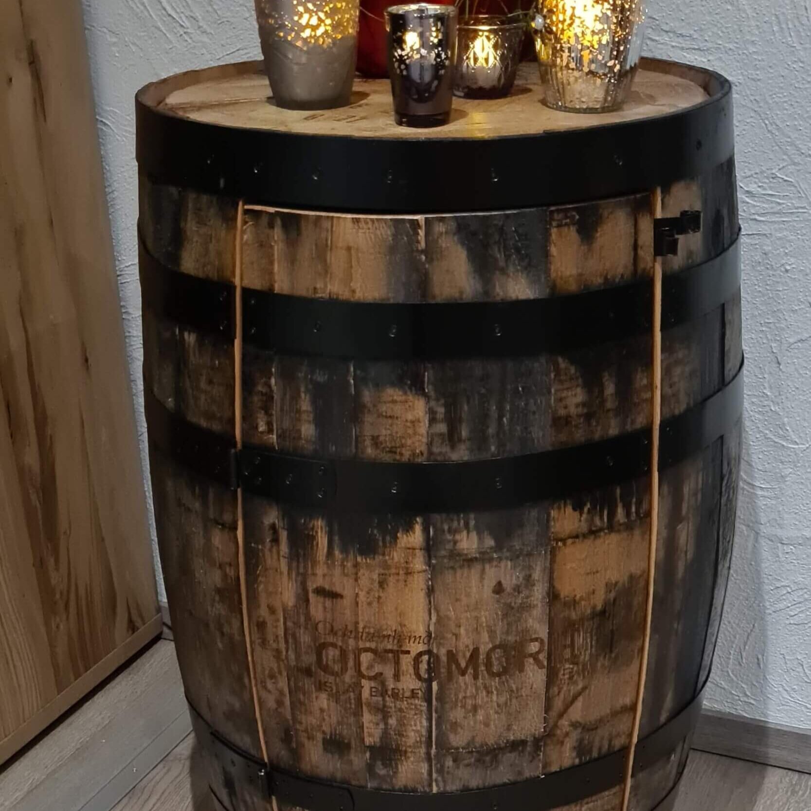 Regalfass aus einem gebrauchten 225 l Barriquefass, durch Meisterhand umgebaut als exklusives Weinlagerregal mit einem integrierten Barriquefassböden als Abstellfach für Gläser und Flaschen.