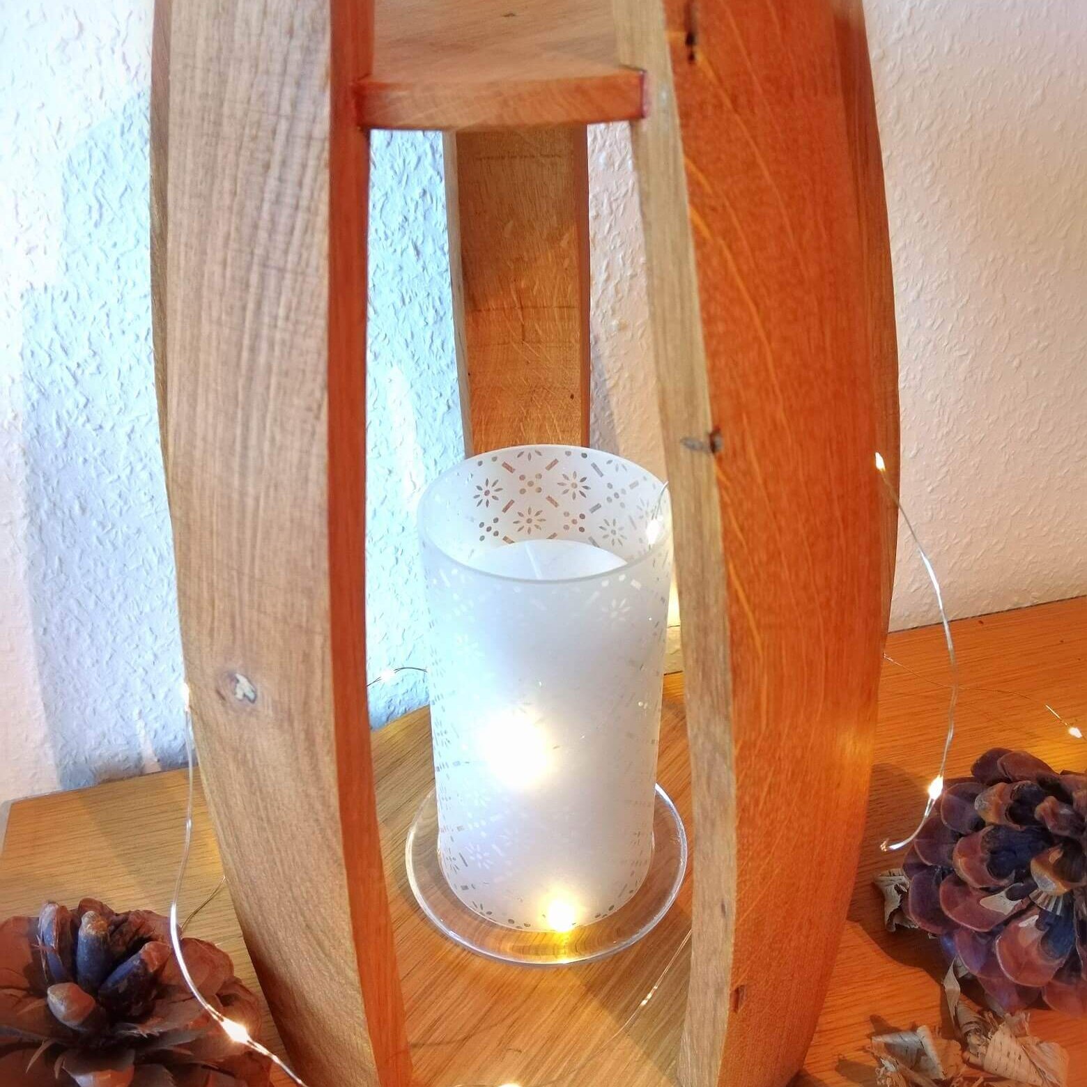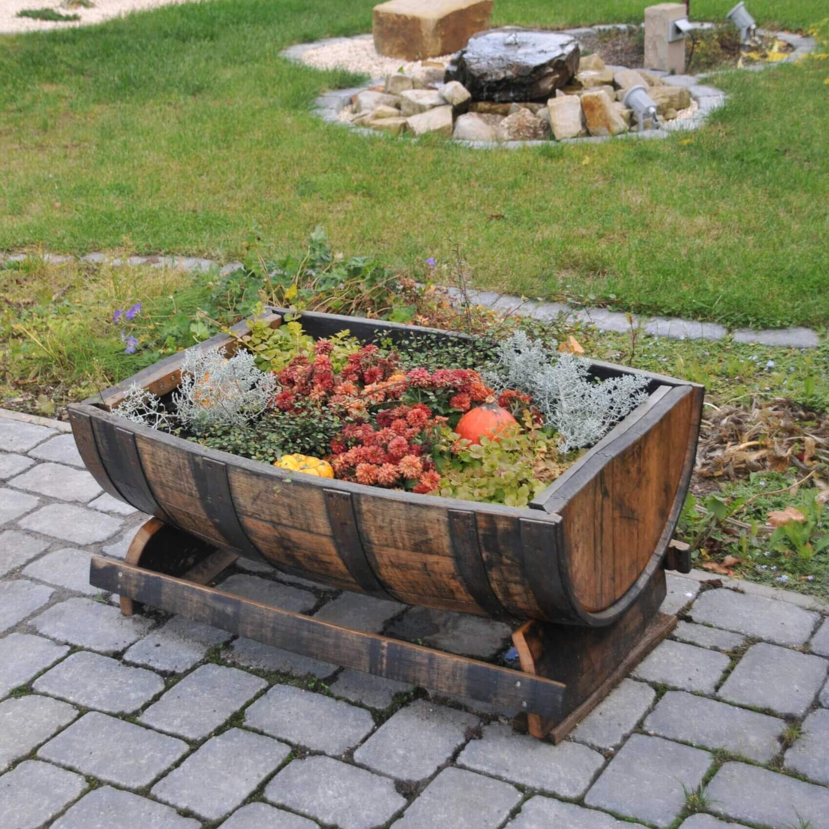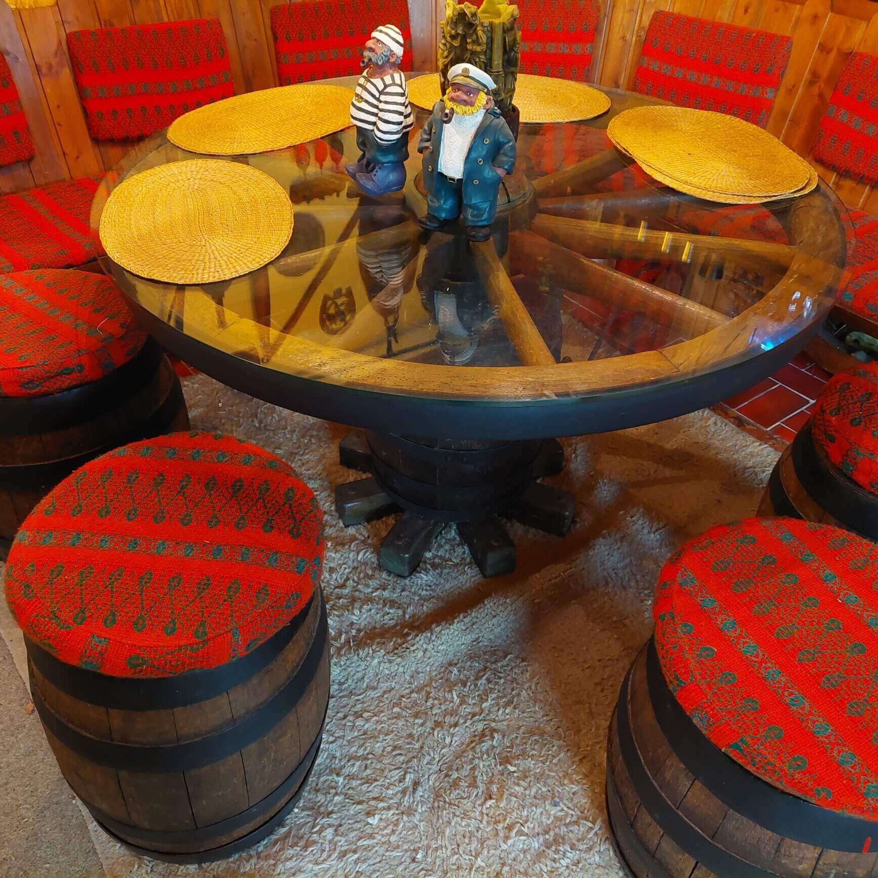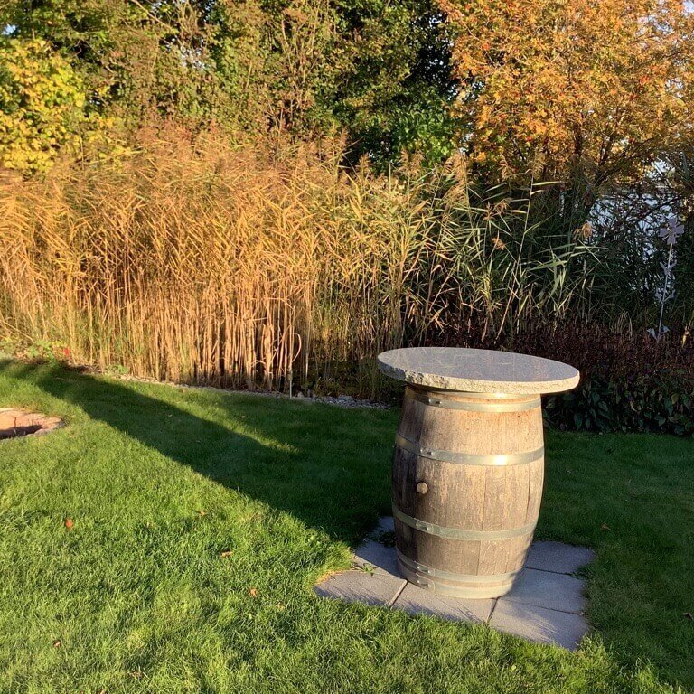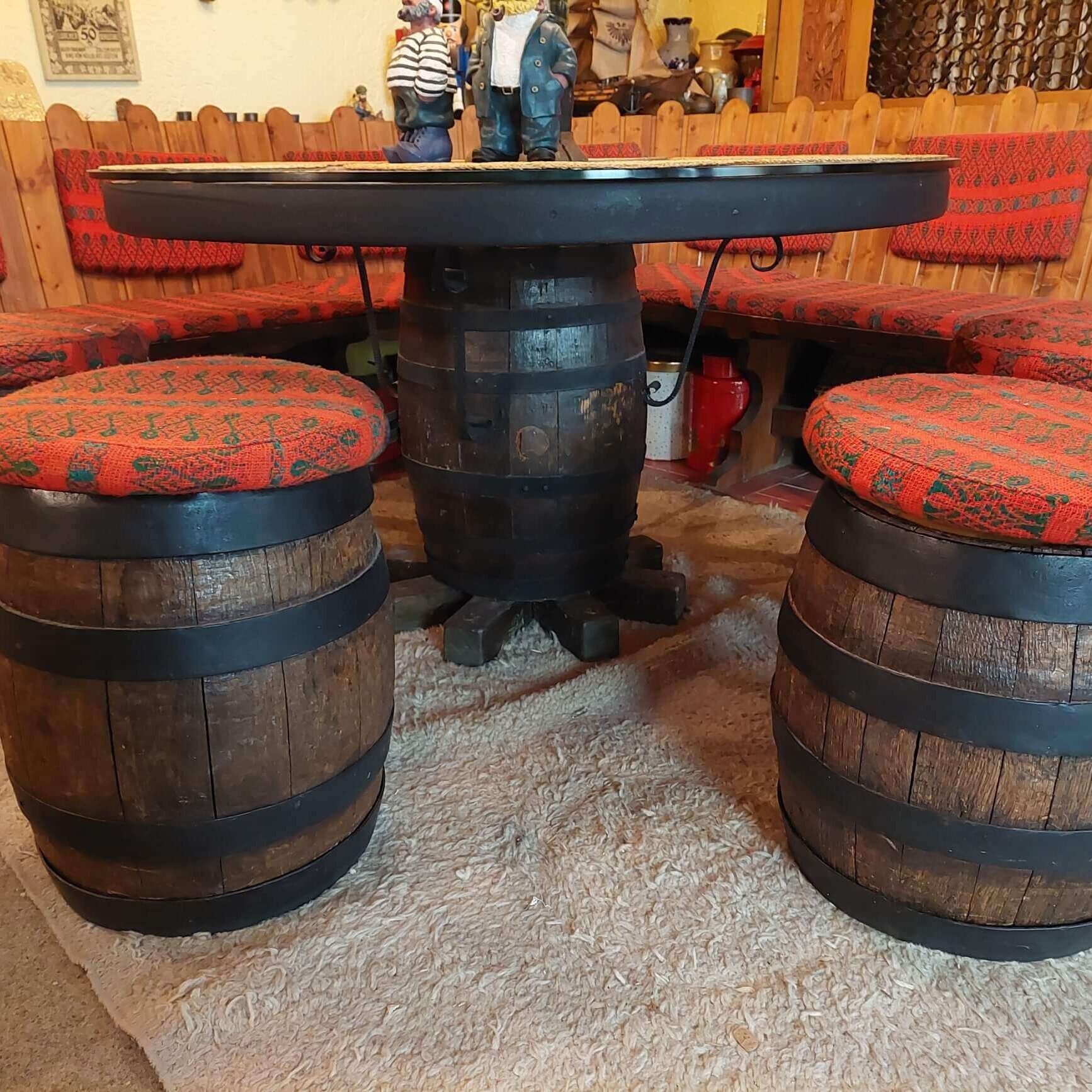 Regalfass aus einem gebrauchten 225 l Barriquefass, durch Meisterhand umgebaut als exklusives Weinlagerregal mit einem integrierten Barriquefassböden als Abstellfach für Gläser und Flaschen.
