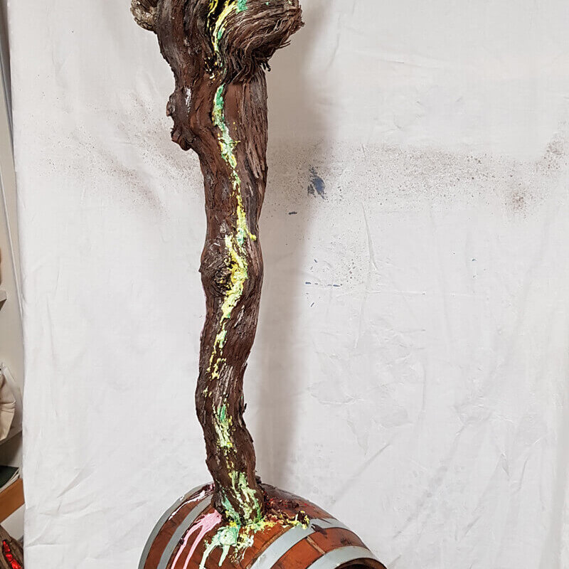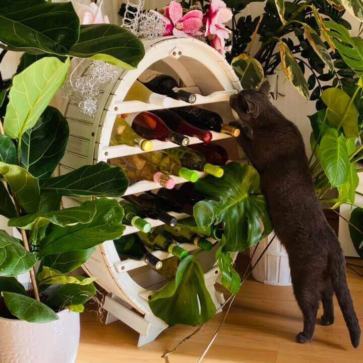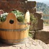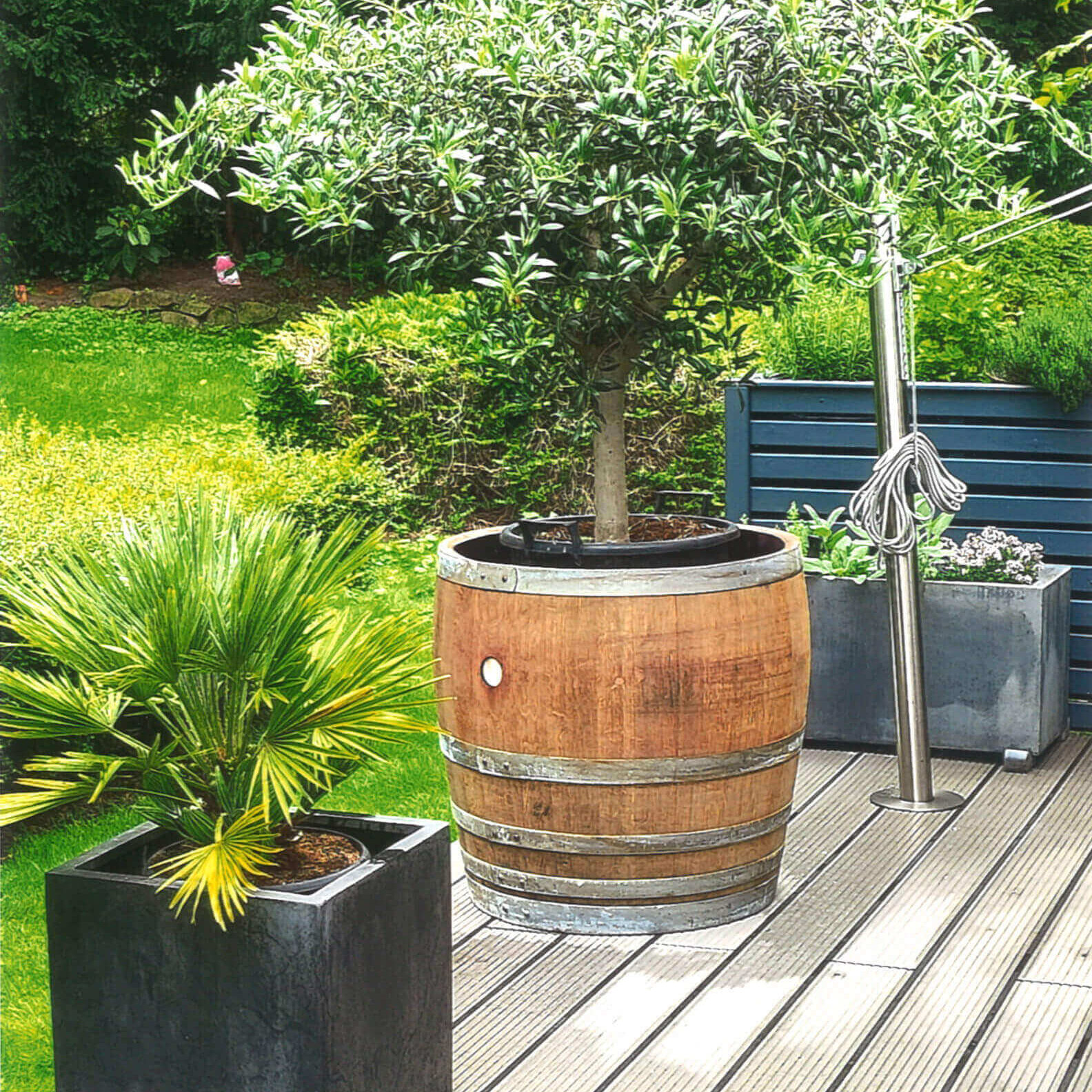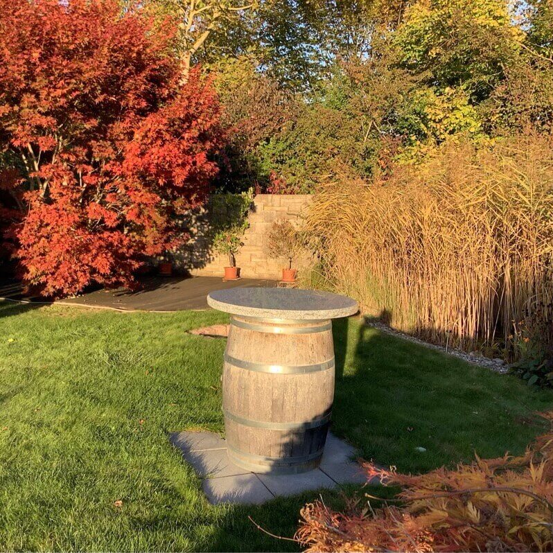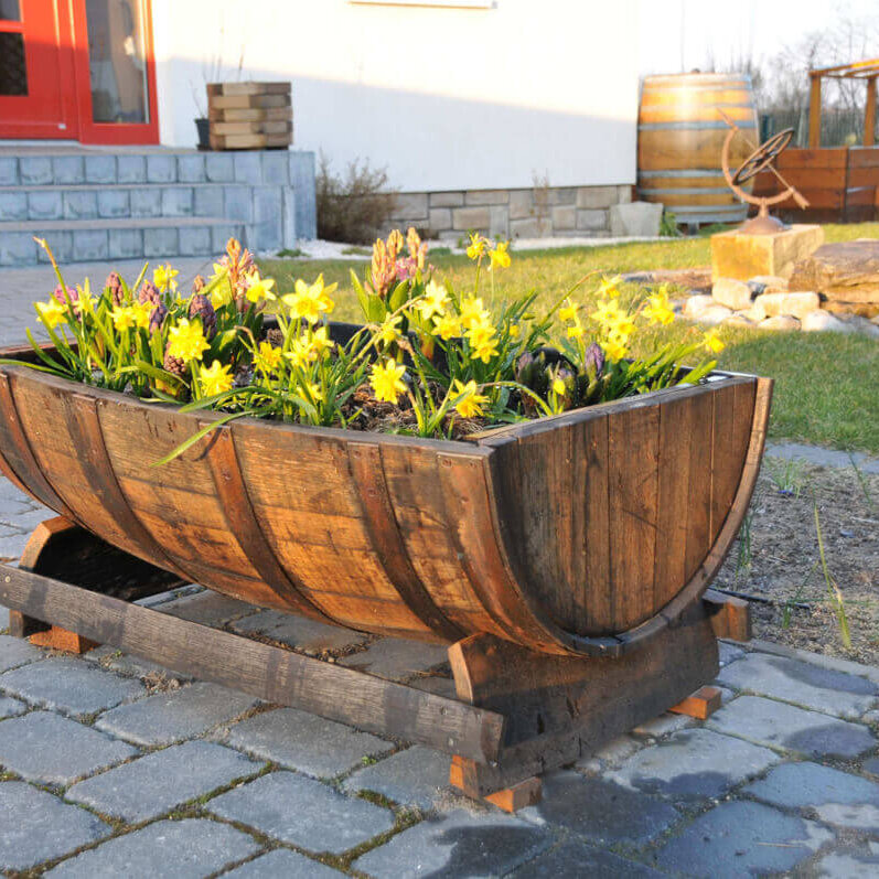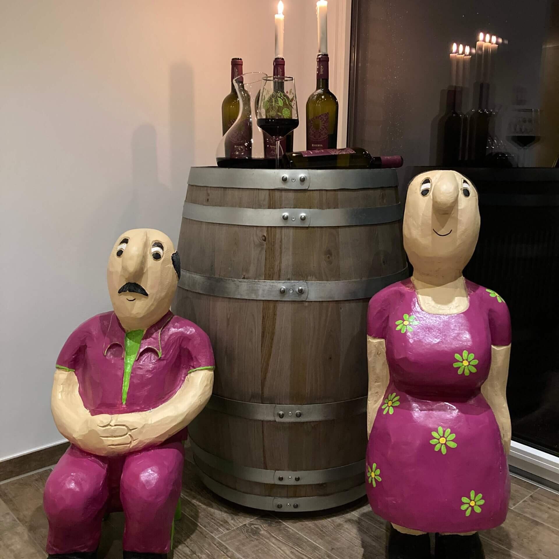 Regalfass aus einem gebrauchten 225 l Barriquefass, durch Meisterhand umgebaut als exklusives Weinlagerregal mit einem integrierten Barriquefassböden als Abstellfach für Gläser und Flaschen.