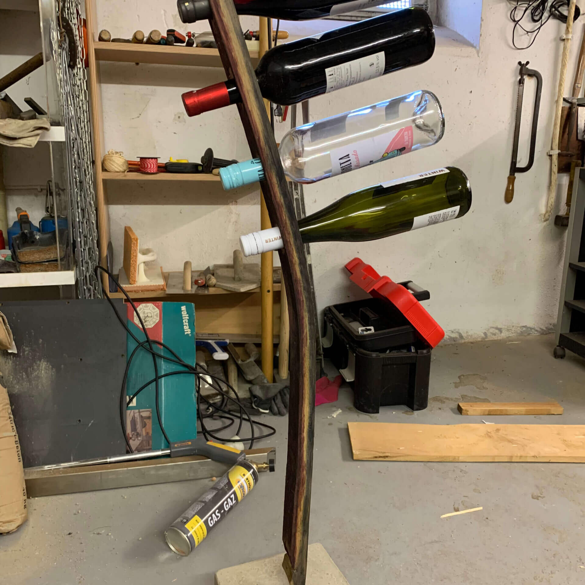 Stylischer Weinflaschenständer für eine Flasche Wein 0,75 bis 1 Liter. Durch den Winkel am Ständerboden wird die Flasche wie von Geisterhand getragen.